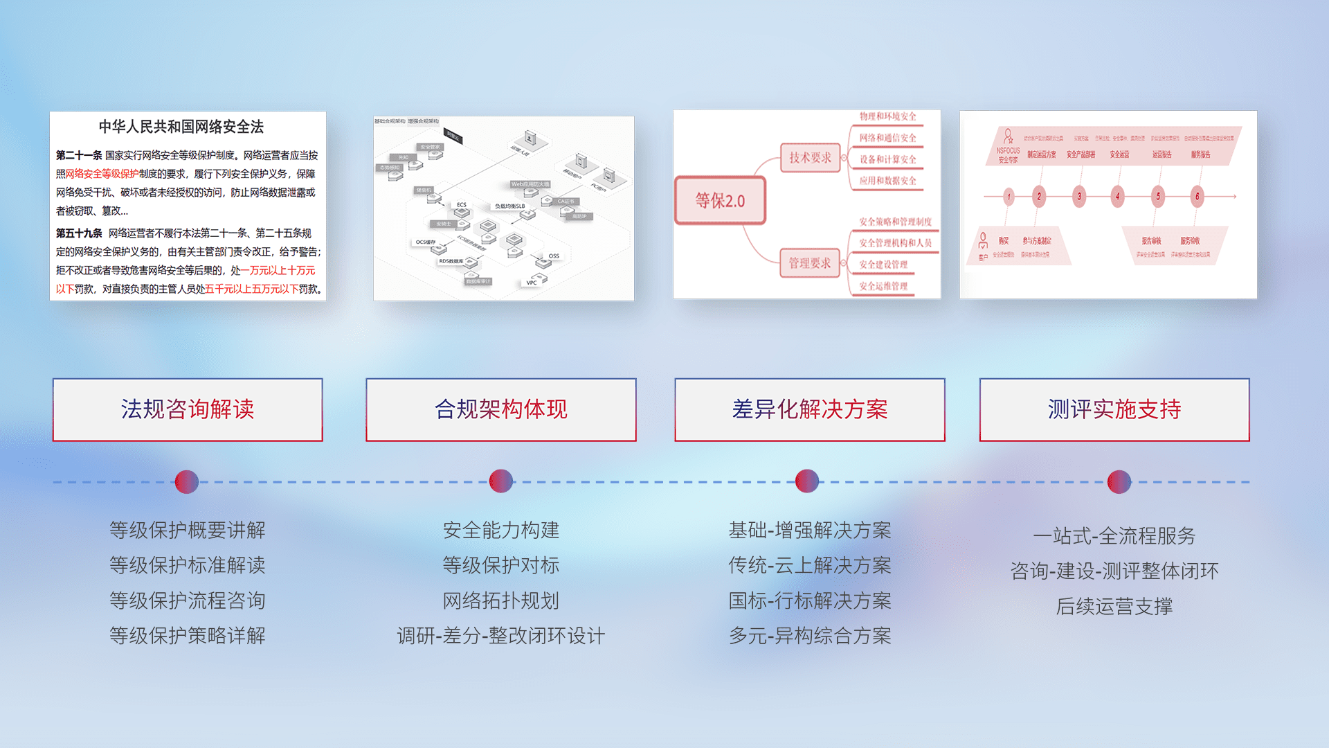 通过专业的法律咨询解读、、、合规架构体现、、、、差异化解决方案、、、、测试实施支持等服务,,,,为客户量身打造等保合规体系。。。